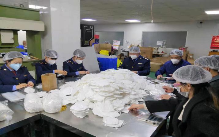 圖為執(zhí)法人員幫助企業(yè)分裝口罩現(xiàn)場(chǎng)