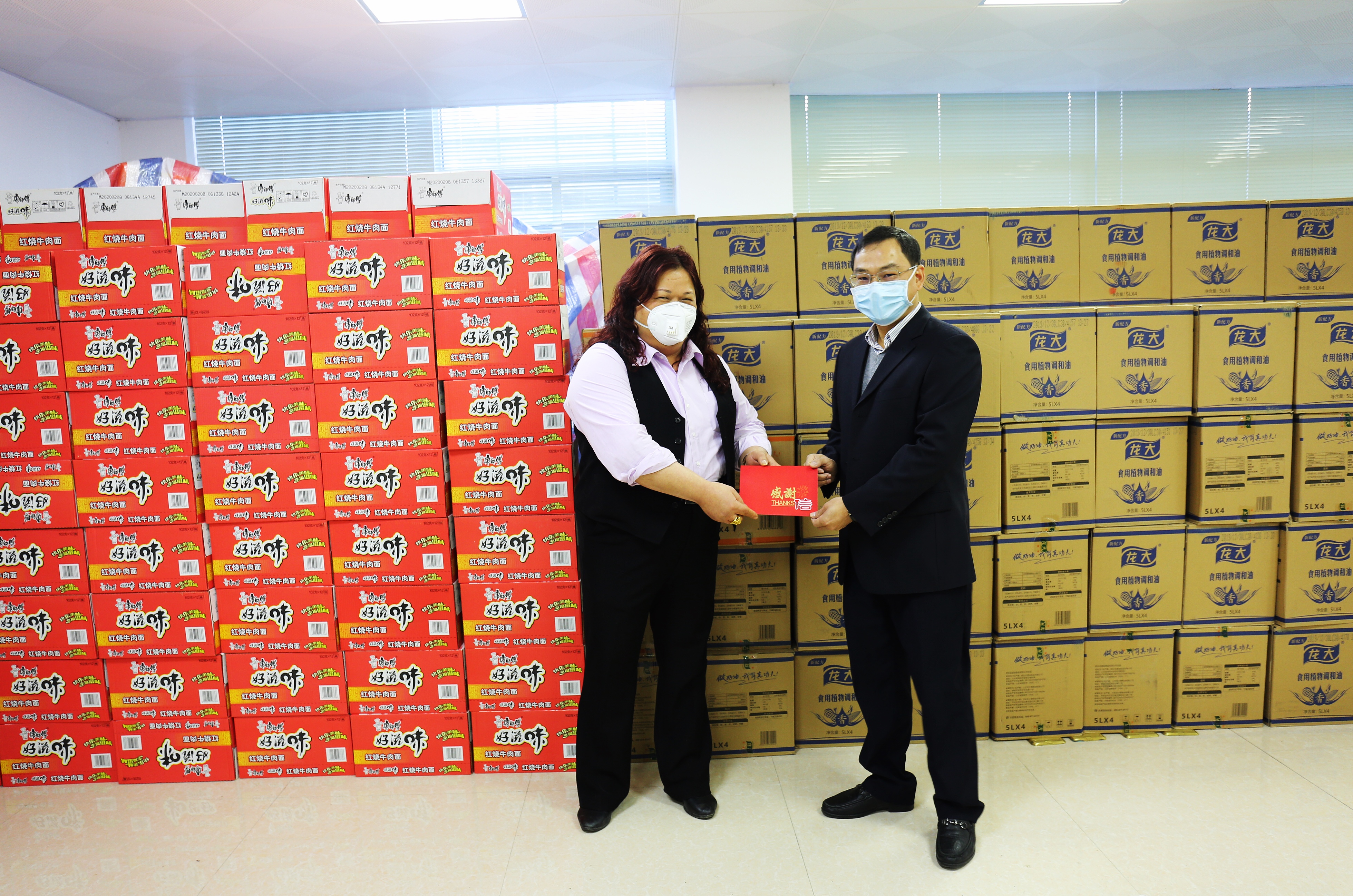 協(xié)會代表為社區(qū)送去口罩、額溫槍等防控物資