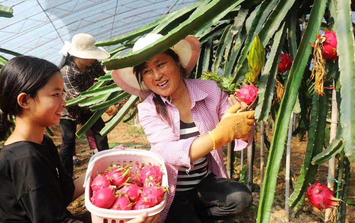 信陽(yáng)光山盛泰達(dá)合作社社員正在收獲火龍果