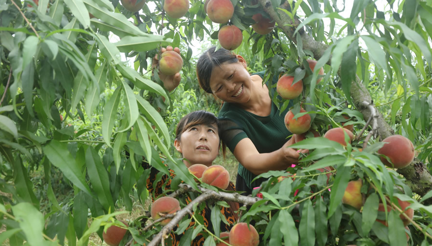 河南省光山縣馬畈鎮(zhèn)太平村瑞全家庭農(nóng)場,村民們在桃園內(nèi)收獲黃金蜜黃桃?