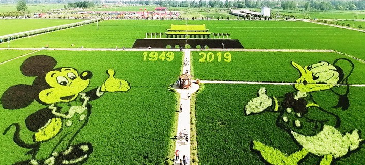 目前,稻田新種植的圖案已長(zhǎng)成,充滿童趣造型的“唐老鴨”“米老鼠”惟妙惟肖、逼真?zhèn)魃?,磅礴大氣的“八仙”造型活靈活現(xiàn)、形神兼?zhèn)洌f嚴(yán)神圣的“慶祝新中國(guó)成立七十周年”造型光彩奪目、振奮人心。一幅幅活靈活現(xiàn)的稻田畫躍然在充滿生機(jī)的土地上,讓游客深刻感觸人與自然和諧共生的美好畫面。