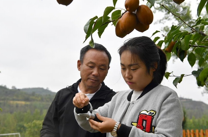 10月9日,在河南省洛寧縣馬店鎮(zhèn)關(guān)廟村,李應(yīng)賢為當(dāng)?shù)卮迕裰v解果樹種植技術(shù)。