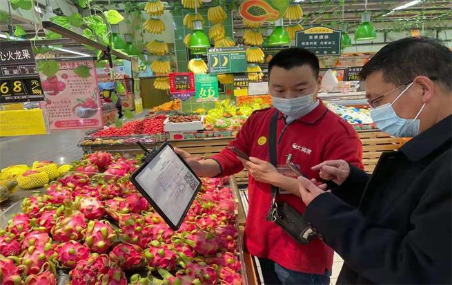 冷鏈專班督查組檢查商超在售冷鏈?zhǔn)称愤M(jìn)貨電子溯源信息