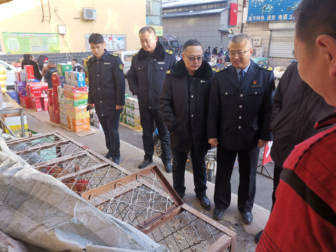 仲崇義局長(zhǎng)與局其他領(lǐng)導(dǎo)一起正在市場(chǎng)檢查活禽????攝影:富成軍